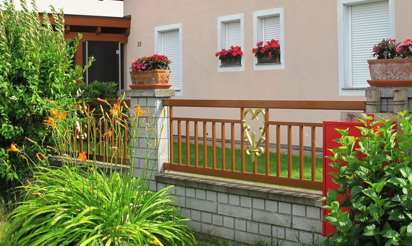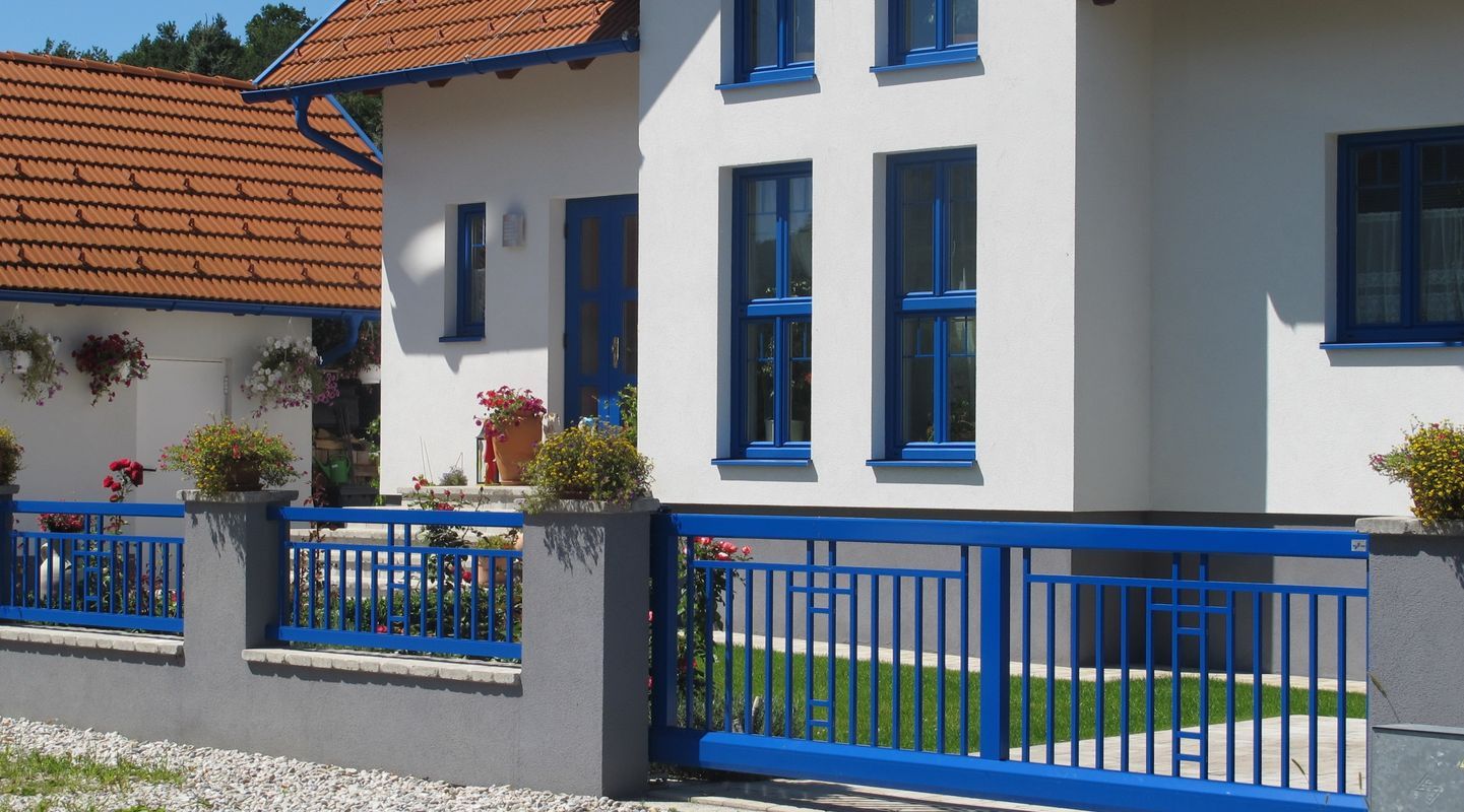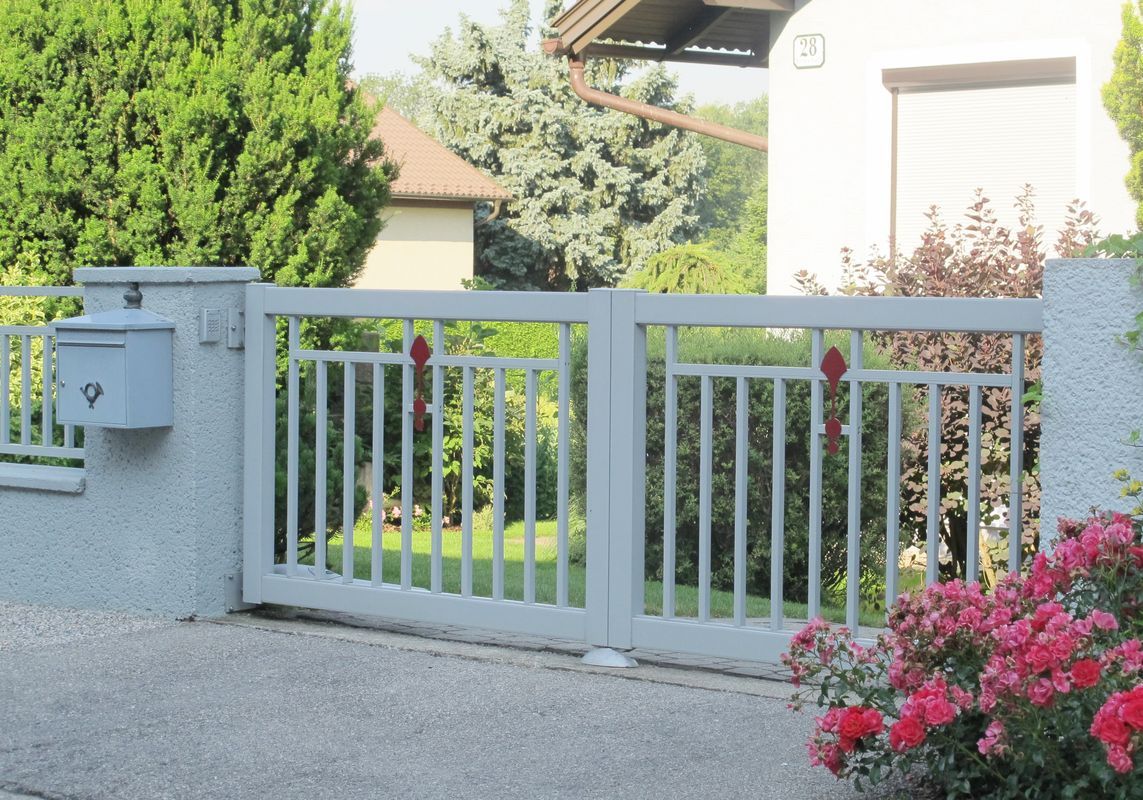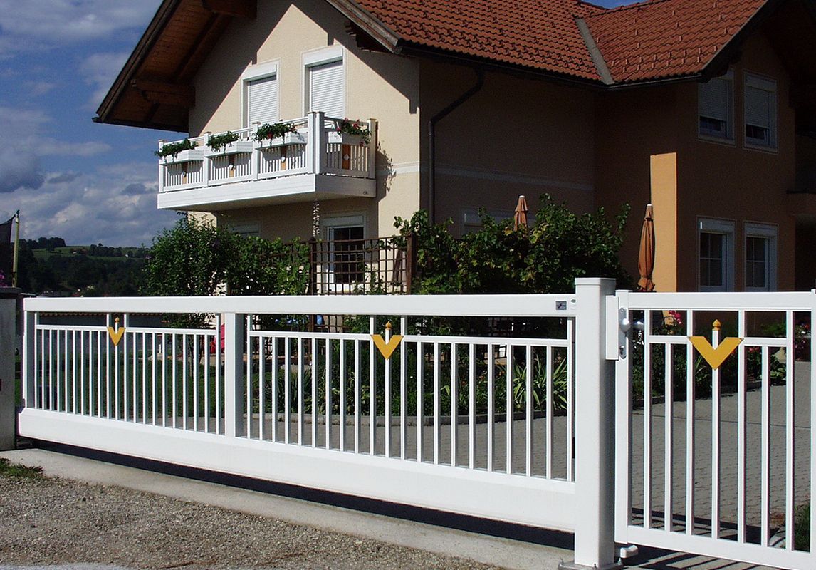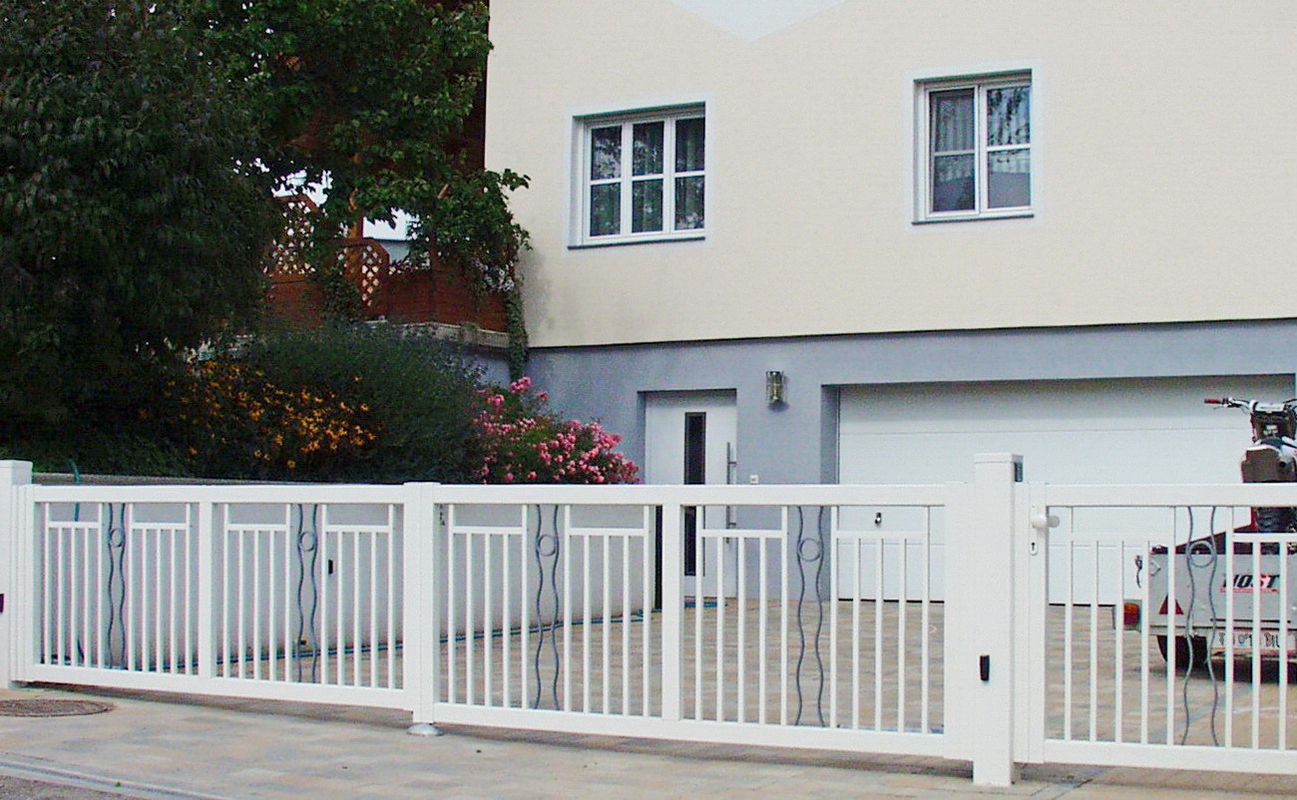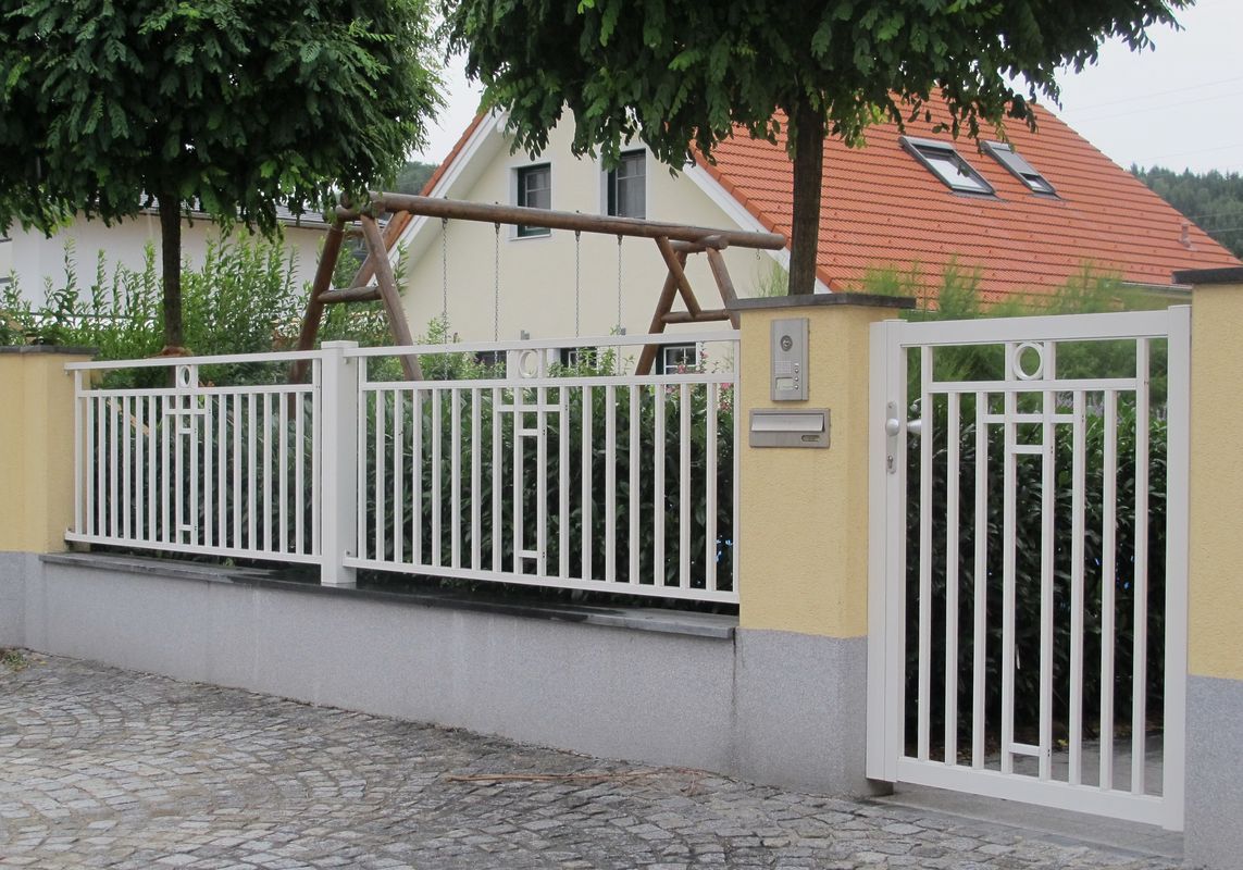 Zaun- und Tor-Modell mit vertikalen Stäben. Diese Geradlinigkeit kann durch verschiedenste Zentral-Ornamente aufgelockert werden.