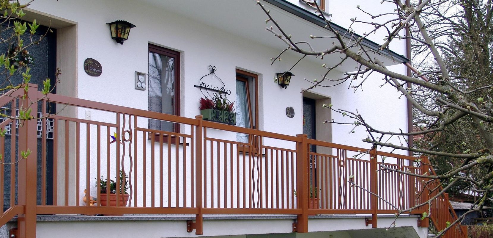 Schiebetor und Tür mit Ornament Palito in gold-elox. Balkongeländer in Modell Staketen.