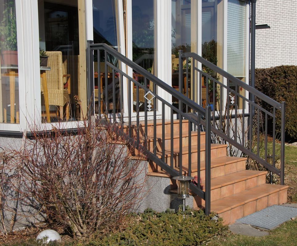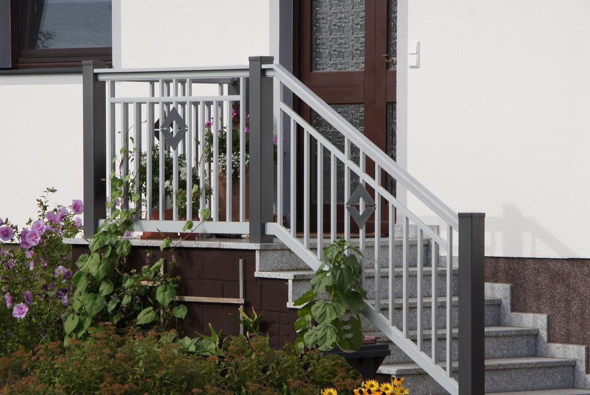 Ausführung in Basis III mit Zierornament Karo und integriertem Handlauf. Schutzleiste für Treppenspalt erforderlich!