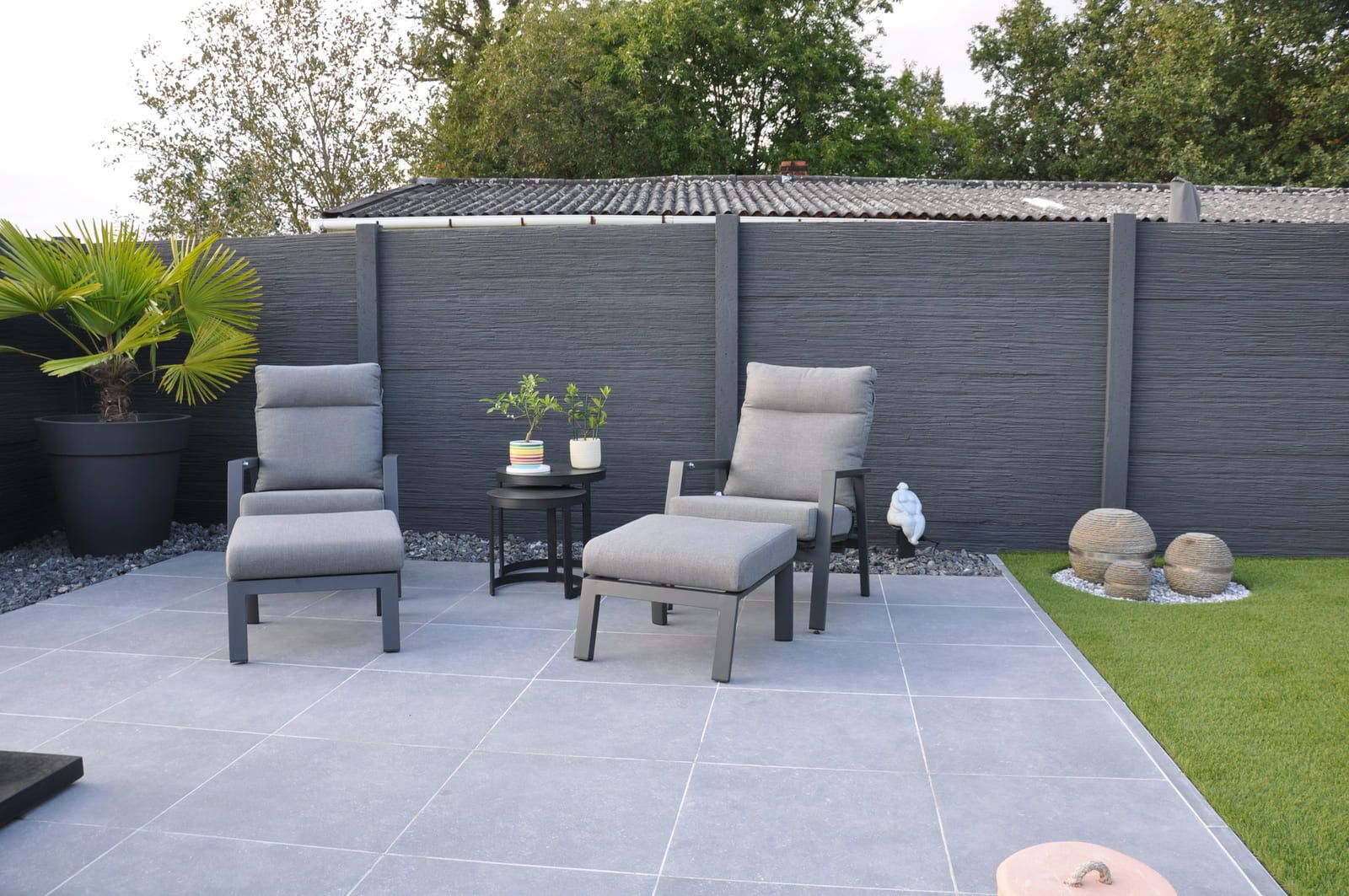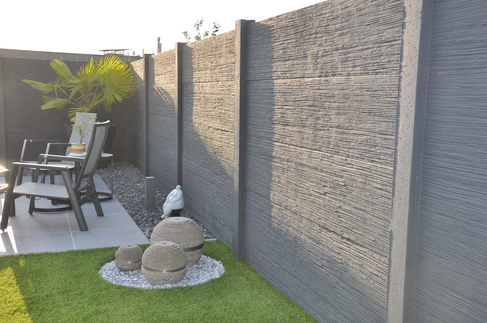 Sitzbereich vor einem Rio Naturel Betonzaunsystem