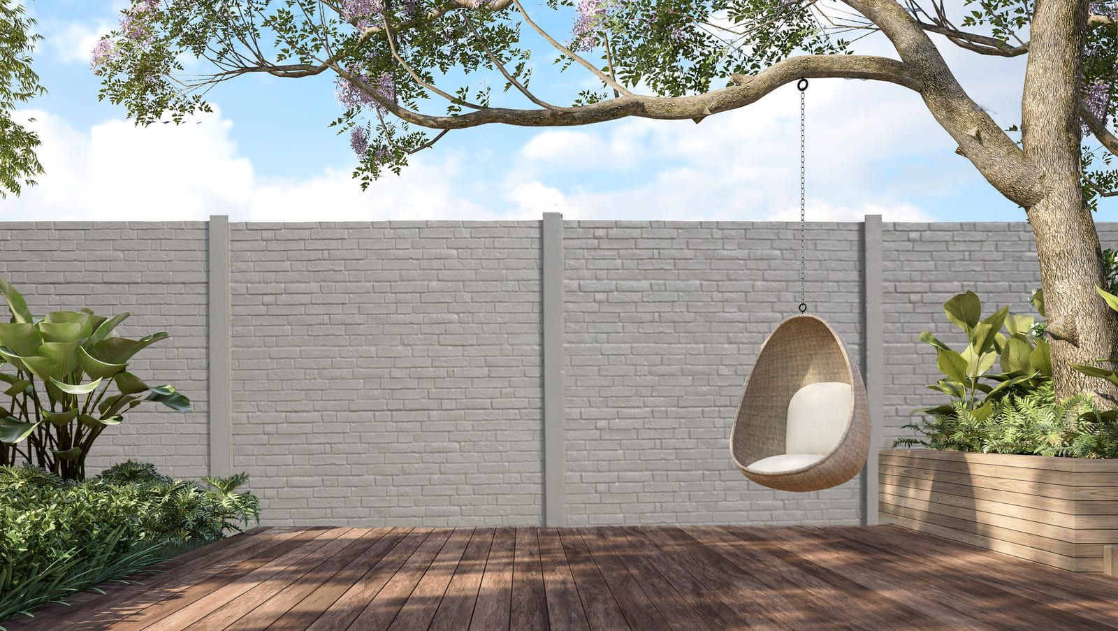 Beispielbild eines Wildstone Naturel Betonzaunsystems mit Sitzbereich
